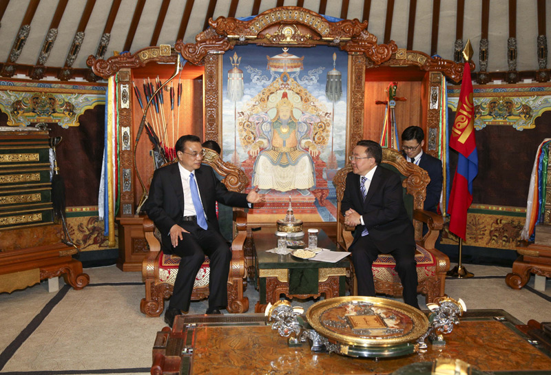 國(guó)務(wù)院總理李克強(qiáng)當(dāng)?shù)貢r(shí)間7月14日上午在烏蘭巴托國(guó)家宮會(huì)見(jiàn)蒙古國(guó)總統(tǒng)額勒貝格道爾吉。