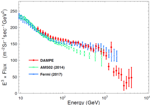 中國(guó)科學(xué)院紫金山天文臺(tái)常進(jìn)科研團(tuán)隊(duì)在中國(guó)科學(xué)院空間科學(xué)戰(zhàn)略性先導(dǎo)科技專(zhuān)項(xiàng)支持下,利用暗物質(zhì)粒子探測(cè)衛(wèi)星“悟空”采集到的約150萬(wàn)顆25GeV以上的電子宇宙射線(xiàn)數(shù)據(jù),獲得了世界上迄今最精確高能電子宇宙線(xiàn)能譜,首次直接測(cè)量到電子宇宙射線(xiàn)能譜在~1 TeV處的拐折,初步顯示在~1.4 TeV處存在能譜精細(xì)結(jié)構(gòu),一旦該精細(xì)結(jié)構(gòu)得以確證,將是粒子物理或天體物理領(lǐng)域開(kāi)創(chuàng)性發(fā)現(xiàn)。相關(guān)成果于2017年11月30日在《自然》雜志在線(xiàn)發(fā)表。