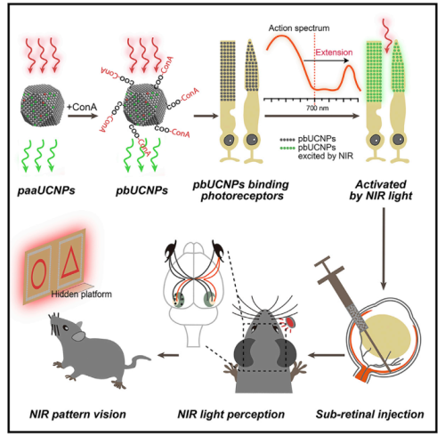 通過(guò)中國(guó)科學(xué)院B類(lèi)戰(zhàn)略性先導(dǎo)科技專(zhuān)項(xiàng)(培育)“衰老的生物學(xué)基礎(chǔ)和干預(yù)策略”組織實(shí)施,中國(guó)科學(xué)技術(shù)大學(xué)研究團(tuán)隊(duì)利用自主發(fā)明的納米顆粒表面修飾方法,將可吸收紅外光發(fā)出可見(jiàn)光的上轉(zhuǎn)換納米材料導(dǎo)入動(dòng)物視網(wǎng)膜,在國(guó)際上首次使哺乳動(dòng)物具備紅外圖像視覺(jué)感知能力,拓展了哺乳動(dòng)物的視覺(jué)波譜范圍。研究成果于2019年2月28日發(fā)表在《細(xì)胞》雜志上。利用這項(xiàng)技術(shù),通過(guò)開(kāi)發(fā)具有不同吸收和發(fā)射光譜參數(shù)的納米材料,將有可能輔助修復(fù)紅色色盲等視覺(jué)感知波譜缺陷相關(guān)疾病。