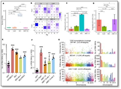 進一步研究將脫靶檢測范圍擴大至RNA水平,首次證明常用的三種單堿基編輯技術均存在大量的RNA脫靶。對其進行突變優(yōu)化后,研究人員最終獲得了能夠完全消除RNA脫靶的高精度單堿基編輯工具。
