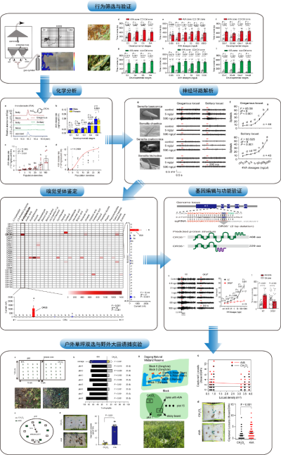 中國科學(xué)院動(dòng)物研究所康樂團(tuán)隊(duì)發(fā)現(xiàn)了一種釋放量低但生物活性非常高的化合物:4—乙烯基苯甲醚(4VA)。4VA對(duì)群居型和散居型飛蝗的不同發(fā)育階段和性別都有很強(qiáng)吸引力,能夠響應(yīng)蝗蟲種群密度變化,它的產(chǎn)生甚至可由4-5只散居飛蝗聚集而觸發(fā)。通過定位在錐型感器中的嗅覺受體OR35,蝗蟲能夠快速感應(yīng)4VA從而聚集。室外草地和蝗蟲野外發(fā)生區(qū)(天津北大港)的區(qū)塊實(shí)驗(yàn)共同證明,4VA對(duì)實(shí)驗(yàn)室種群和野外種群均具有很強(qiáng)的吸引力。該研究不僅揭示了蝗蟲群聚的奧秘,而且使蝗蟲的綠色和可持續(xù)防控成為可能。該研究成果于2020年8月12日發(fā)表于《自然》,在國內(nèi)外引起較大反響。美國科學(xué)院院士萊斯莉·沃斯霍爾在同期《自然》上為該項(xiàng)工作撰寫專文,德國馬普化學(xué)生態(tài)研究所所長比爾·漢森對(duì)該項(xiàng)工作給予高度評(píng)價(jià)。