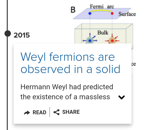 2018年1月,為慶?!拔锢碓u論”系列期刊誕生125周年,美國物理學(xué)會(APS)制作了125周年紀(jì)念論文集。該論文集共收錄了49項(xiàng)對物理學(xué)產(chǎn)生重要影響的工作,包括密立根油滴實(shí)驗(yàn)、康普頓散射、EPR佯謬、發(fā)現(xiàn)核磁共振、楊-米爾斯場論、宇稱不守恒、BCS超導(dǎo)理論、密度泛函理論、希格斯玻色子、氦3超流、拓?fù)湮飸B(tài)理論、量子霍爾效應(yīng)、發(fā)現(xiàn)準(zhǔn)晶、釔鋇銅氧高溫超導(dǎo)、巨磁阻效應(yīng)、三維拓?fù)浣^緣體、發(fā)現(xiàn)引力波等重大科學(xué)成就,其中許多工作已被諾貝爾獎和其他重要獎項(xiàng)所認(rèn)可。中國科學(xué)院物理研究所研究團(tuán)隊(duì)的工作“固體中發(fā)現(xiàn)外爾費(fèi)米子”也名列其中,這是唯一入選的來自中國本土的工作。