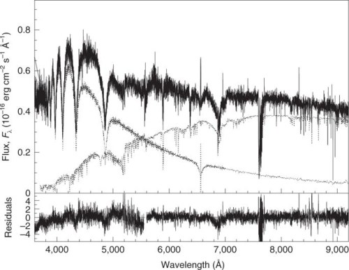 該白矮星+冷亞矮星雙星的光學光譜。上圖中黑色實線顯示的是X-Shooter/VLT拍攝的光學光譜:在藍端可以看到明顯的DA型白矮星特征——氫巴爾末吸收線;紅端可以看到冷亞矮星的特征——在6800埃附近有寬的CaH分子帶。上圖中黑色虛線顯示的是最佳擬合的兩子星(白矮星和冷亞矮星)的模板譜。下圖顯示的是擬合殘差。