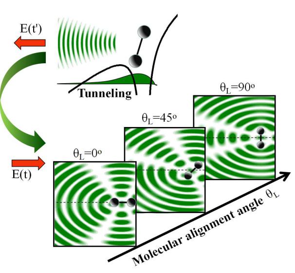 分子自層析成像原理圖。飛秒強(qiáng)激光驅(qū)動(dòng)下氣相分子發(fā)生隧穿電離,當(dāng)激光電場(chǎng)反向時(shí),隧穿電離電子波包返回分子的雙原子中心附近并與之發(fā)生相互作用,形成光電子衍射圖案。通過解析不同分子軸取向下的光電子譜可以直接提取出分子核間距信息。