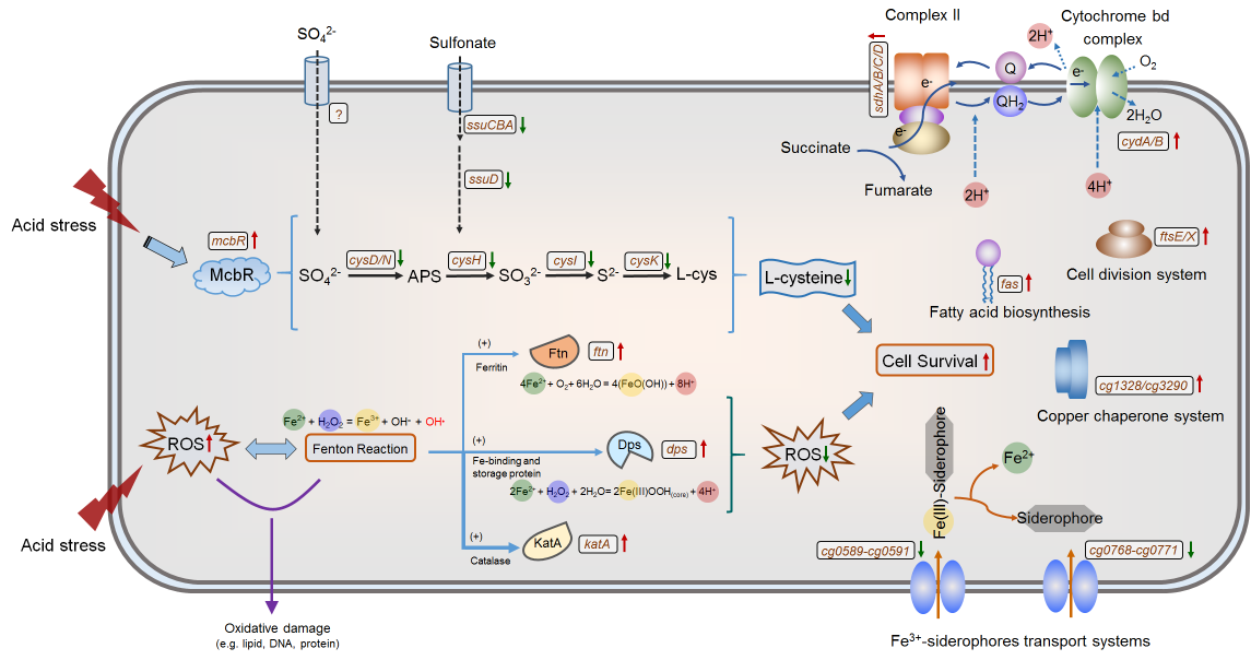 中國(guó)科學(xué)院天津工業(yè)生物技術(shù)研究所研究員劉君帶領(lǐng)的微生物生理和代謝工程研究組利用適應(yīng)性進(jìn)化策略篩選獲得了一株谷氨酸棒桿菌耐酸菌株,通過(guò)比較分析進(jìn)化菌株與原始菌株的生理特性差異,并結(jié)合轉(zhuǎn)錄組測(cè)序數(shù)據(jù),對(duì)進(jìn)化菌株的耐酸機(jī)理進(jìn)行了詳細(xì)研究。結(jié)果表明,相較于原始菌株,進(jìn)化菌株在低酸脅迫下能更好地保持細(xì)胞結(jié)構(gòu)的完整性,同時(shí)維持更高的胞內(nèi)pH和較低的胞內(nèi)活性氧水平,進(jìn)而實(shí)現(xiàn)低酸脅迫下更強(qiáng)的生長(zhǎng)和存活能力。通過(guò)轉(zhuǎn)錄組分析發(fā)現(xiàn),與原始菌株相比,在低酸脅迫下進(jìn)化菌株中心代謝途徑中多個(gè)關(guān)鍵基因表達(dá)上調(diào),提示進(jìn)化菌株比原始菌株具有更高的胞內(nèi)代謝活性。此外,研究中還發(fā)現(xiàn)和鑒定出多個(gè)候選抗酸元件,如銅伴侶蛋白Cg1328、細(xì)胞分裂蛋白FtsE/X、脂肪酸合成酶Fas、分子伴侶HscA等。進(jìn)一步研究揭示,KatA-Dps (過(guò)氧化氫酶-饑餓誘導(dǎo)DNA保護(hù)蛋白)介導(dǎo)的胞內(nèi)活性氧清除過(guò)程和McbR (硫代謝調(diào)控因子)介導(dǎo)的硫元素同化抑制效應(yīng)能夠協(xié)同參與谷氨酸棒桿菌的低酸脅迫耐受應(yīng)答,是影響谷氨酸棒桿菌抗酸生理性能的重要因素,通過(guò)表達(dá)實(shí)驗(yàn)也證實(shí)上述抗酸元件是代謝改造提高菌株抗酸特性的重要靶點(diǎn)之一。該研究將有助于更好地認(rèn)識(shí)和理解谷氨酸棒桿菌在低酸脅迫環(huán)境下的生理適應(yīng)策略,對(duì)于尋求微生物生理功能最優(yōu)化和目標(biāo)產(chǎn)物積累最大化的工業(yè)發(fā)酵生產(chǎn)具有重要指導(dǎo)意義。