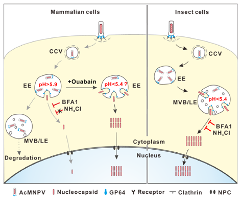 桿狀病毒是一類昆蟲特異性的大DNA病毒,部分桿狀病毒(如模式株AcMNPV)可以攜帶外源基因入侵多種哺乳動(dòng)物細(xì)胞,被認(rèn)為是一種潛在的基因轉(zhuǎn)導(dǎo)和基因治療載體。然而,桿狀病毒對(duì)哺乳動(dòng)物細(xì)胞的轉(zhuǎn)導(dǎo)效率普遍較低,極大限制了其作為基因治療載體的應(yīng)用。前期研究發(fā)現(xiàn),當(dāng)病毒吸附于哺乳動(dòng)物細(xì)胞表面,通過低pH誘導(dǎo)病毒與細(xì)胞質(zhì)膜發(fā)生膜融合,可使病毒轉(zhuǎn)導(dǎo)變得高效(Dong et al., 2010, J Virol)。為了揭示其機(jī)制,該研究系統(tǒng)比較了AcMNPV入侵哺乳動(dòng)物細(xì)胞和昆蟲細(xì)胞的精細(xì)過程,發(fā)現(xiàn)病毒在早期內(nèi)吞體中的低效融合是病毒入侵哺乳動(dòng)物細(xì)胞的關(guān)鍵限制步驟。通過對(duì)病毒膜蛋白GP64進(jìn)行突變分析,發(fā)現(xiàn)病毒入侵哺乳動(dòng)物細(xì)胞比昆蟲細(xì)胞需要更高的融合活性。此外,通過使用化學(xué)藥物特異性地降低早期內(nèi)吞體的pH,可增強(qiáng)GP64的融合活性,大幅度提高AcMNPV在多種哺乳動(dòng)物細(xì)胞中的轉(zhuǎn)導(dǎo)效率。該研究不僅加深了對(duì)桿狀病毒入侵細(xì)胞分子機(jī)制的認(rèn)識(shí),也將促進(jìn)桿狀病毒在基因治療領(lǐng)域的應(yīng)用。