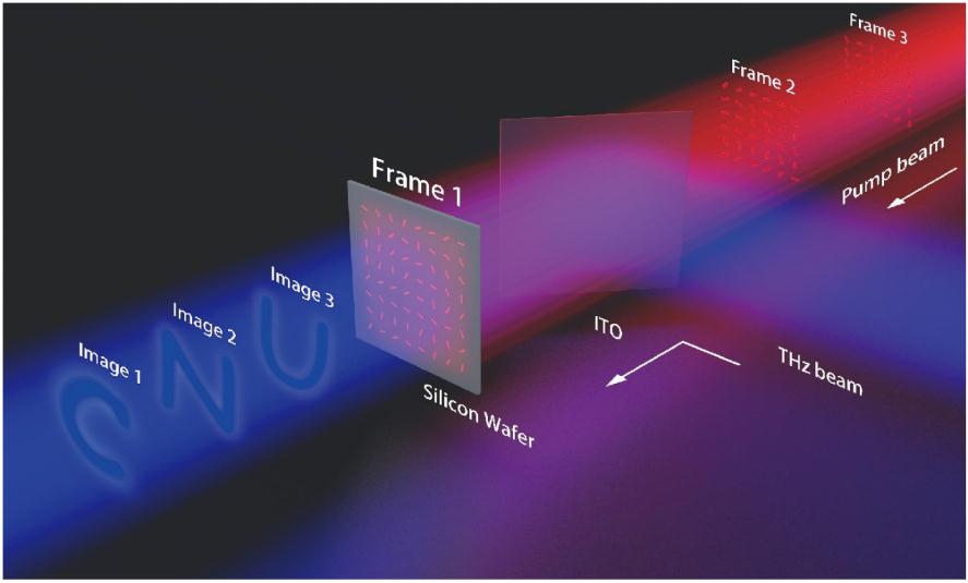 研究團(tuán)隊(duì)使用高強(qiáng)度飛秒激光器,基于光電導(dǎo)效應(yīng),將圖案投射到硅片上產(chǎn)生超表面效應(yīng),以調(diào)制太赫茲脈沖。太赫茲的輸出隨投影圖案的改變而發(fā)生相應(yīng)的變化,從而實(shí)現(xiàn)光控可重構(gòu)太赫茲超表面。用光照射半導(dǎo)體硅片時(shí),產(chǎn)生載流子并導(dǎo)致電導(dǎo)率增加。當(dāng)電導(dǎo)率上升到某個(gè)值時(shí),被照射區(qū)域可視為金屬或弱金屬化材料。由于金屬結(jié)構(gòu)常用于超表面,故圖案化的光照半導(dǎo)體可實(shí)現(xiàn)類似的功能;當(dāng)撤去照明光時(shí),載流子迅速?gòu)?fù)合到初始狀態(tài)。