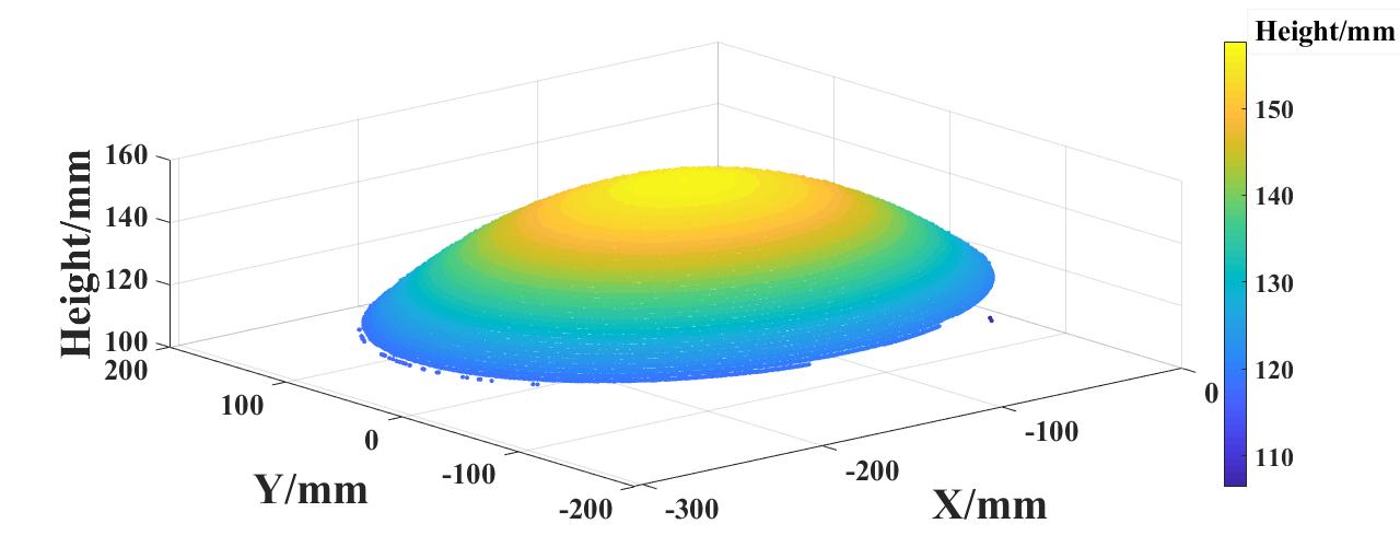 該課題組提出,用雙目光學三維測量方法重建透鏡粗毛坯的表面。雙目視覺原理類似于人眼的三維感知,如圖1所示。左右兩個不同位置不同角度放置的攝像機,同步拍攝毛坯表面圖像,經(jīng)過同源點匹配和視差計算,可以用三角法對毛坯表面進行三維重構(gòu)。但是,由于透鏡毛坯強散射特性,基于空域的結(jié)構(gòu)光編碼方法會出現(xiàn)解碼誤差。課題組提出用時域散斑技術(shù)進行時域方向的編碼,實驗中順序投影20幅帶通隨機數(shù)字散斑圖像,對于每個像素點,都有一個20維度的編碼。通過比較左右待匹配點碼值之間的漢明距,可以在極線方向?qū)ふ业酵袋c對。另一方面,偏振技術(shù)被運用于消除透鏡毛坯的多次反射問題。最終,全場的三維點云數(shù)據(jù)在短時間內(nèi)被成功重建出,如圖2所示。