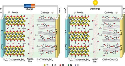 近日,中國科學(xué)院大連化學(xué)物理研究所二維材料與能源器件研究組研究員吳忠?guī)浥c中科院金屬研究所研究員王曉輝團隊合作,采用二維金屬碳化物MXene為負(fù)極,碳納米管為正極,具有氧化還原活性的對苯二酚為正極電解液添加劑,構(gòu)建了氫離子“搖椅”式高比能超級電容器,相關(guān)成果發(fā)表在《美國化學(xué)會-納米》(ACS Nano)上。