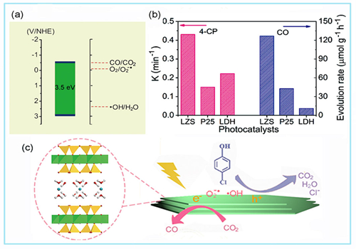 近日,中國科學(xué)院新疆理化技術(shù)研究所環(huán)境科學(xué)與技術(shù)研究室副研究員王蘭團(tuán)隊(duì),以源于蛭石的活性二氧化硅為基體,利用液相外延生長法,成功合成了新型的層狀硅酸鋅納米片材料,并用于光催化降解有機(jī)污染物和光還原CO2制CO。該研究主要利用天然層狀硅酸鹽(蛭石)的二維特性和Si源,在晶格匹配效應(yīng)的作用下,通過液相外延生長技術(shù),實(shí)現(xiàn)了Zn元素在硅氧四面體層間的成功置入,最終得到了單分散的二維硅酸鋅納米片。該材料具有蛭石狀的晶體結(jié)構(gòu),片層厚度為8~15nm,直徑約為200nm,帶隙寬度為3.5eV,同時(shí)具有優(yōu)異的光催化氧化和還原性能,可有效降解4-氯苯酚有機(jī)污染物的還原CO2為CO,其速率分別是P25(商業(yè)化TiO2)的2.9倍和3倍。理論計(jì)算和實(shí)驗(yàn)表明,該材料具有較正的價(jià)帶電位和較負(fù)的還原電位、大的比表面積和較為豐富的表面活性位點(diǎn),因此呈現(xiàn)出了較高的光催化氧化和還原活性。該研究成果進(jìn)一步拓展了二維光催化材料的種類,使得類粘土礦結(jié)構(gòu)的金屬硅酸鹽在光催化領(lǐng)域的應(yīng)用成為可能,也為其它新型二維材料的制備及應(yīng)用提供了一定的借鑒。