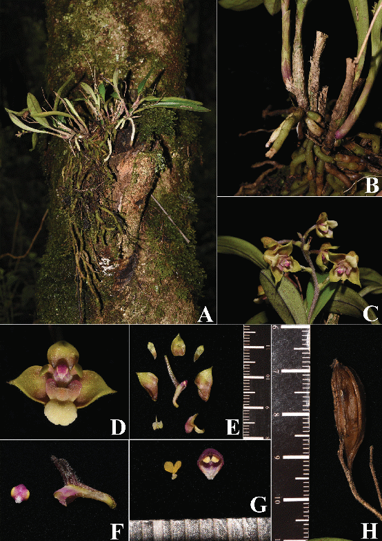 該種在形態(tài)和DNA分子序列特征上與P. spatella和P. kermesina兩種相近,但其新生假鱗莖多從前一輪假鱗莖的基部節(jié)上長(zhǎng)出,僅少數(shù)著生于中間或上部節(jié)上;苞片長(zhǎng)圓形,長(zhǎng)4毫米,寬3毫米,先端微凹且具尾狀短尖;中萼片近卵形,長(zhǎng)5–7毫米,寬 3–4.5 毫米,這些特征使其容易與這兩個(gè)相似種相區(qū)分。