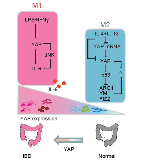 在這項最新的研究中,首次報道巨噬細胞中特異性敲除YAP明顯減輕DSS誘導腸炎的發(fā)生,這主要由于YAP抑制M2型巨噬細胞極化,并促進巨噬細胞向M1型極化及產生促炎炎癥因子IL-6。有意思的是,YAP cKO小鼠也能促進腸道部位抗菌肽的產生,進而影響腸道菌群的平衡。這與其他課題組2015年Nature報道YAP在腸上皮細胞中通過促進其修復再生,從而減輕腸炎的功能不同。這些研究發(fā)現有助于充分了解在IBD的發(fā)展中,YAP在不同類型細胞中的多種功能。