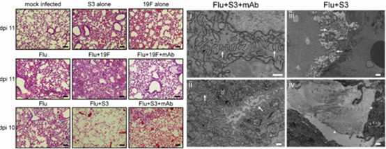 在這項成果中,科研人員采用了動物模型和多國病人樣本進行研究發(fā)現(xiàn),一種宿主蛋白ANGPTL4在肺部感染后會大量分泌并促進肺部水腫。經(jīng)過基因敲除和單克隆抗體處理后的小鼠在肺炎鏈球菌繼發(fā)感染時則顯示出更好的抗生素治療效果,同時肺部水腫降低、肺部組織得到了更好的保護。