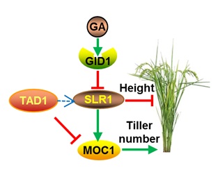 株高和分蘗是影響水稻株型和產(chǎn)量的核心要素。分蘗數(shù)直接影響有效穗數(shù),因此對(duì)水稻產(chǎn)量的形成具有重要影響。株高能夠直接影響作物的耐肥性和抗倒伏性,矮化育種推動(dòng)了第一次“綠色革命”的發(fā)生。水稻的株高與分蘗通常存在一種負(fù)相關(guān)的關(guān)系,株高高的水稻一般分蘗較少,而株高矮的水稻一般分蘗較多。赤霉素是影響水稻株高的主要激素之一。生產(chǎn)實(shí)踐中,對(duì)水稻秧苗噴施適宜濃度的GA合成抑制劑多效唑,可以使秧苗矮化,促進(jìn)分蘗的增加。然而,人們對(duì)赤霉素如何協(xié)同調(diào)控水稻株高與分蘗的分子機(jī)理仍不清楚。解析水稻株高與分蘗協(xié)同調(diào)控的分子機(jī)理具有重要的科學(xué)意義與理論價(jià)值,對(duì)水稻株型改良及品種設(shè)計(jì)具有重要的應(yīng)用價(jià)值。