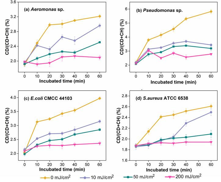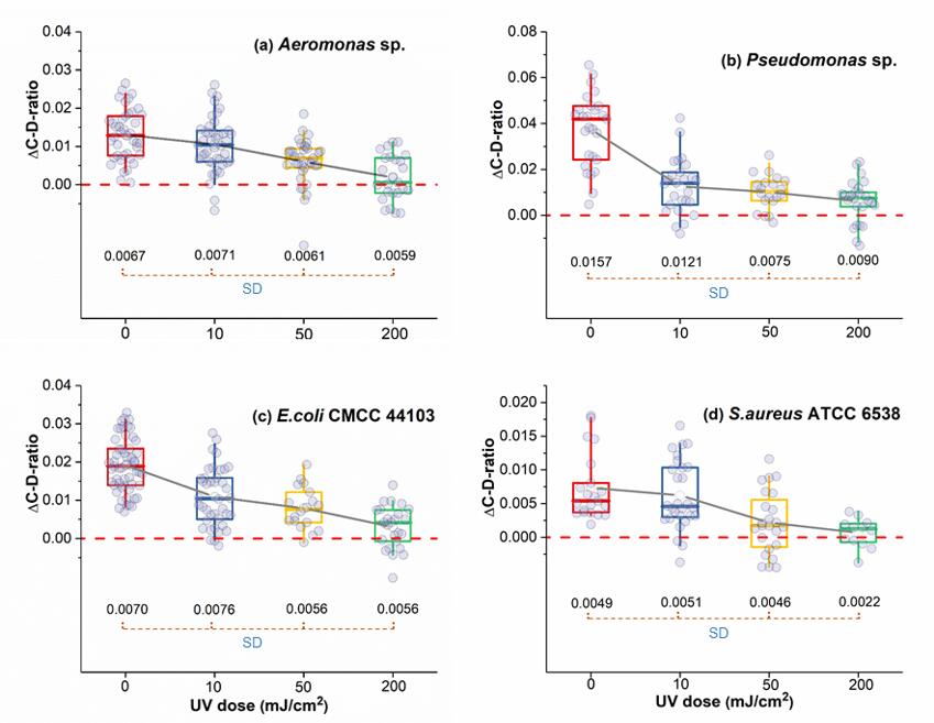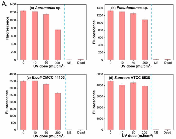 中國(guó)科學(xué)院城市環(huán)境研究所于鑫團(tuán)隊(duì)在表征VBNC細(xì)菌活性方面取得新進(jìn)展,研究成果以Population and single cell metabolic activity of UV-induced VBNC bacteria determined by CTC-FCM and D2O-labeled Raman Spectroscopy 為題發(fā)表在Environment International上。該工作以從水環(huán)境中分離的兩株條件致病菌(Aeromonas sp. 和 Pseudomonas sp.)以及兩株模式菌株(E.coli 和 S.aureus)作為研究對(duì)象,考察不同UV劑量下對(duì)其VBNC狀態(tài)的誘導(dǎo)作用。并運(yùn)用CTC-FCM和重水標(biāo)記單細(xì)胞拉曼光譜的方法在群體和單細(xì)胞水平上表征了VBNC細(xì)菌的呼吸活性和代謝活性。