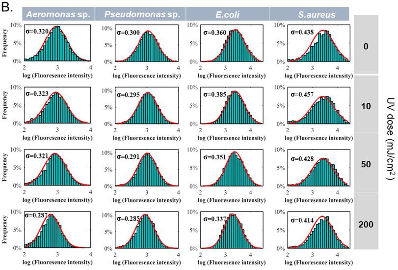 該項(xiàng)工作系統(tǒng)分析了VBNC細(xì)菌的活性和UV劑量的關(guān)系。結(jié)果表明,在各UV劑量下(0-200 mJ/cm2),由CTC-FCM所檢測(cè)的呼吸活性保持在較高水平,并且其與UV劑量之間沒(méi)有明顯的劑量-效應(yīng)關(guān)系。只要細(xì)菌活著,具有不同受損水平或不同休眠程度的細(xì)菌之間的活性沒(méi)有顯著差異。由此表明,CTC-FCM適用于檢測(cè)維持細(xì)菌生理活動(dòng)的基礎(chǔ)活性。然而,由重水-拉曼所檢測(cè)的細(xì)胞代謝活性與UV劑量之間呈現(xiàn)了顯著的劑量-效應(yīng)關(guān)系。眾所周知,H2O以直接或間接的方式廣泛參與細(xì)胞代謝活動(dòng),如有機(jī)物的合成和利用過(guò)程。基于此,D2O標(biāo)記的拉曼方法適用于確定細(xì)胞的重要生理和生化指標(biāo)的總體代謝活性(包括基本活性)。其次,該項(xiàng)研究能夠在單細(xì)胞水平上檢測(cè)VBNC細(xì)菌活性,并能得到其異質(zhì)性代謝活性分布。該結(jié)果對(duì)于優(yōu)化滅菌過(guò)程具有重要意義,可以基于此確定更經(jīng)濟(jì)和更安全的消毒劑量。最后,該項(xiàng)工作的結(jié)果表明模式菌株和環(huán)境菌株表現(xiàn)出不同的抗逆性。例如,與大腸桿菌相比,Aeromonas sp.,這一環(huán)境菌株在可培養(yǎng)性方面表現(xiàn)出對(duì)UV消毒更強(qiáng)的敏感性,但該環(huán)境菌株卻能保持更高的代謝活性,這一結(jié)果對(duì)UV消毒的實(shí)際應(yīng)用具有一定的指導(dǎo)意義。該項(xiàng)研究的第一作者是博士生郭立崢,通訊作者是研究員于鑫和張勝華,研究得到王寬誠(chéng)教育基金、國(guó)家自然科學(xué)基金、國(guó)家重點(diǎn)研發(fā)計(jì)劃等的支持。