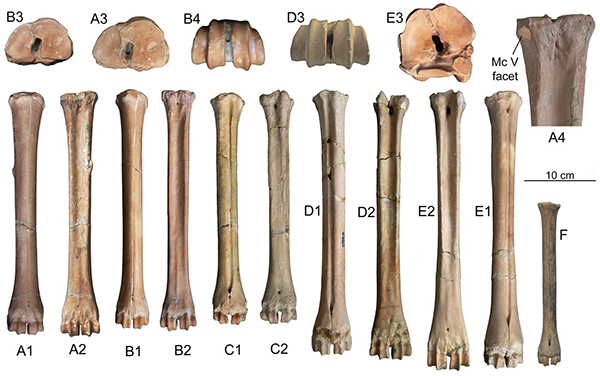 圖3. 泥河灣山神廟咀遺址新發(fā)現(xiàn)的布氏真枝角鹿掌、蹠骨化石及與梅花鹿蹠骨(F)的比較(同號(hào)文供圖)