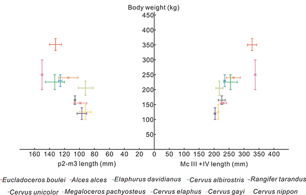 圖4. 從下頜齒列及掌、蹠骨長度對(duì)布氏真枝角及其它鹿類進(jìn)行的體重估算(張貝供圖)