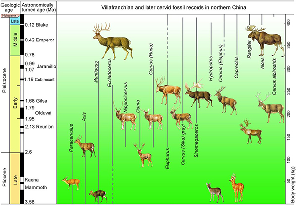 圖5. 維拉方期以來我國北方鹿類動(dòng)物的體重估算及地史分布(同號(hào)文供圖)