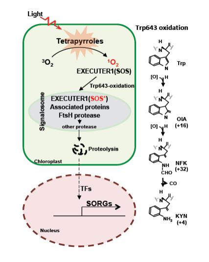 圖:EX1介導(dǎo)1O2信號(hào)通路。游離四吡咯類(lèi)化合物,如葉綠素,在吸收光能后產(chǎn)生的單線氧分子(1O2)。1O2可以氧化EX1 SOS結(jié)構(gòu)域(即DUF3506結(jié)構(gòu)域)中643位的色氨酸。氧化后的EX1及其復(fù)合物被FtsH蛋白酶體識(shí)別并降解,是1O2信號(hào)得以被識(shí)別并進(jìn)一步傳遞的先決條件。EX1在被降解過(guò)程中可能釋放出向細(xì)胞核傳遞的信號(hào)分子,進(jìn)而調(diào)控細(xì)胞核中1O2特異性基因的表達(dá),完成由葉綠體向細(xì)胞核的反向信號(hào)傳導(dǎo)。