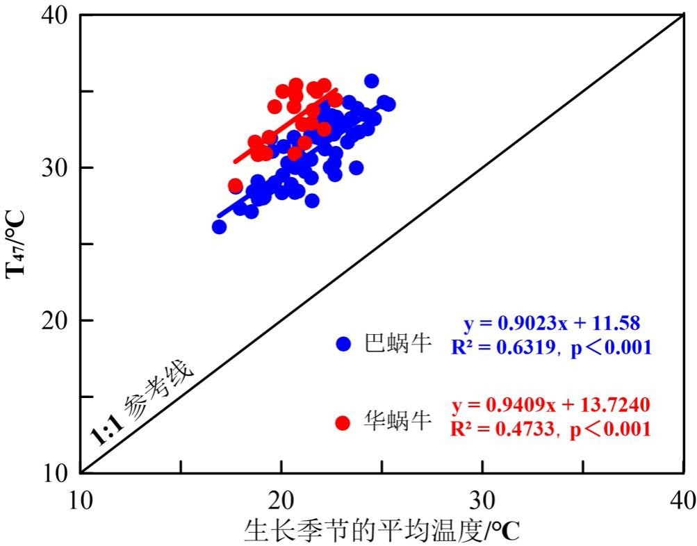 圖1 巴蝸牛、華蝸牛殼體T47和生長季溫度的關(guān)系