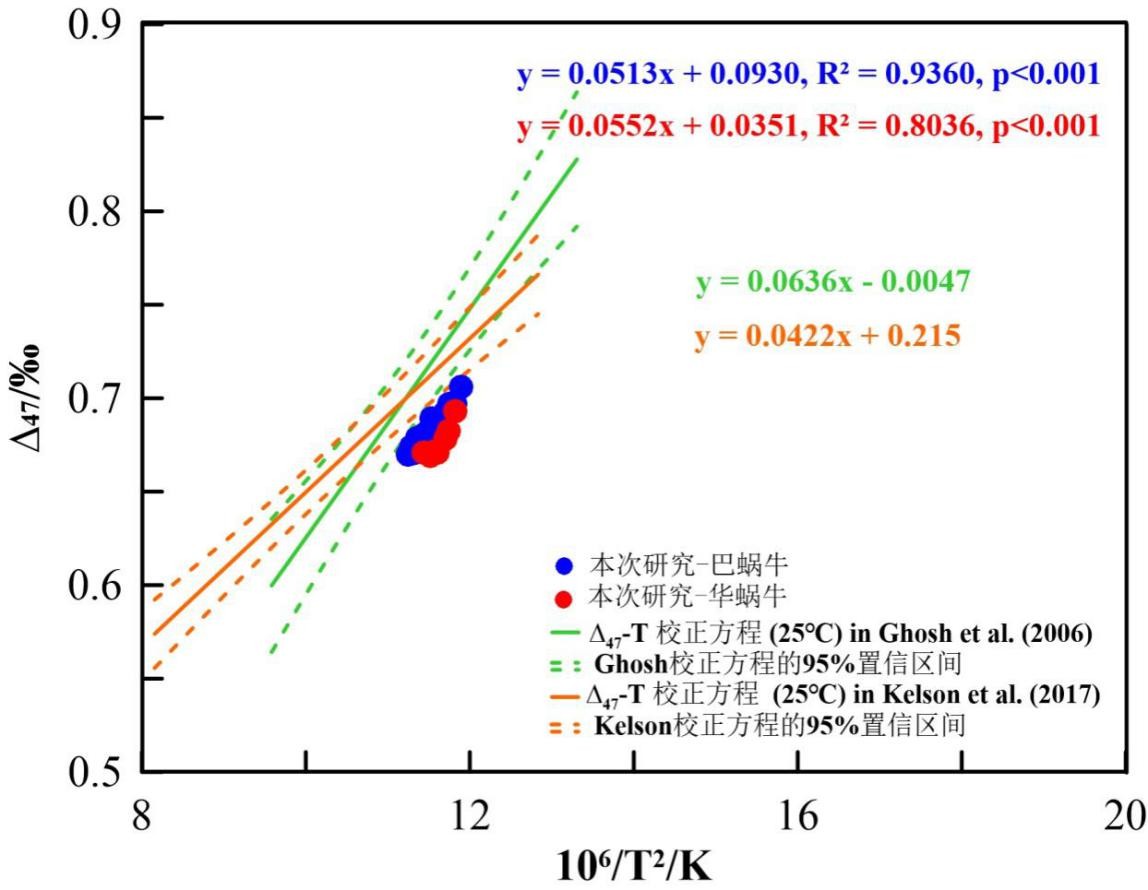 (1)雖然蝸牛殼體團(tuán)簇同位素溫度(T47)和年均溫(MAT)沒有相關(guān)性,但是兩者差值(T47-MAT)與年均溫(MAT)卻存在負(fù)相關(guān)關(guān)系。這可能表明在溫度較低的地方,蝸牛會選擇在溫度較高的月份進(jìn)行活動并分泌殼體。通過對數(shù)據(jù)的系統(tǒng)分析,最終確定以年均溫10℃和20℃為界,將蝸牛的生長季劃分為三類:當(dāng)MAT <10℃時,蝸牛生長季為夏季(6-8月);當(dāng)MAT 在10~20℃之間,蝸牛生長季擴(kuò)展至整個溫暖月份(4-10月);當(dāng)MAT >20℃時,蝸牛全年生長。由此,發(fā)現(xiàn)T47和生長季節(jié)溫度有很好的正相關(guān)性(圖1),并給出△47與蝸牛生長季節(jié)平均溫度的轉(zhuǎn)換方程分別為:巴蝸牛△47 =(0.0513 ± 0.0036)× 106/T2 + 0.0930 ± 0.0413),R2=0.9360;華蝸牛△47=(0.0552±0.0111)× 106/T2 + 0.0351 ± 0.1293),R2=0.8036。其中,T為開爾文溫度(圖2)。