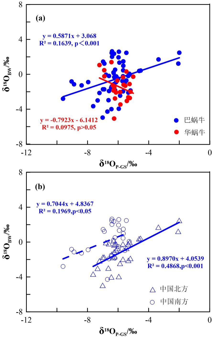 圖3 (a)巴蝸牛、華蝸牛體液氧同位素(δ18OBW)和蝸牛生長季降雨氧同位素(δ18OP-GS)的關(guān)系;(b)中國南方和北方巴蝸牛δ18OBW和δ18OP-GS的關(guān)系