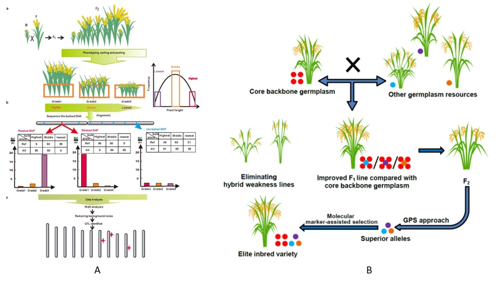 圖:A)GPS定位QTL的流程;B)雜種優(yōu)勢(shì)基因定位及設(shè)計(jì)育種示意圖(彩色圓點(diǎn)代表優(yōu)良基因)