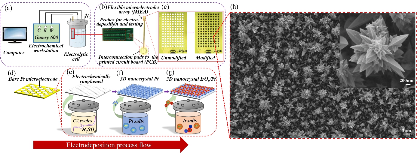 ?。╝)電化學修飾裝置示意圖;(b)微電極陣列排布;(c)微電極表面修飾前后的光學顯微圖像;(d)-(g)微電極表面修飾流程圖;(h)氧化銥/鉑納米材料微觀形貌