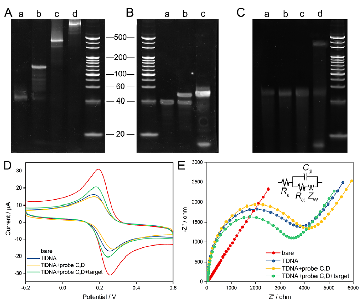 圖2 (A)DNA四面體形成、(B)鏈置換反應及(C)雙足DNA步行的聚丙烯酰胺凝膠電泳驗證。(D)循環(huán)伏安與(E)交流阻抗譜驗證電極界面反應過程