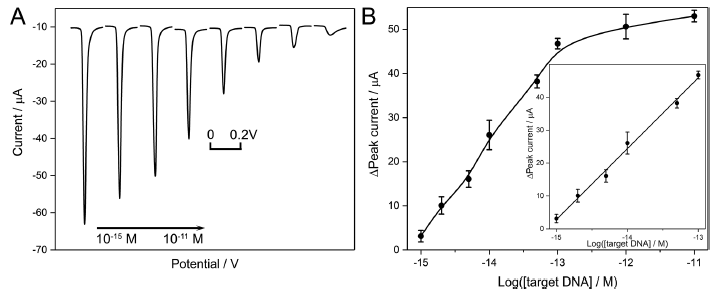 圖3 (A)基于雙足步行器進行核酸檢測的線性掃描伏安圖。(B)對應的標準曲線