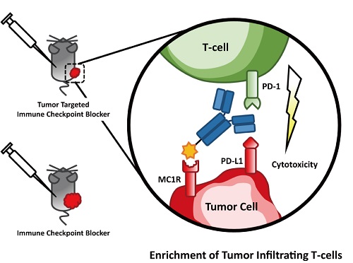 在這一研究中,作者將促黑素細胞激素類似物 NDP-MSH通過化學連接的方法,與PD-L1抗體產(chǎn)生共價鏈接,形成雙特異型抗體NDP-MSH-αPD-L1。通過實驗分析說明,雙特異型抗體NDP-MSH-αPD-L1對于黑色素瘤細胞表面的MC1R受體和PD-L1都有很強的結(jié)合活性。在小鼠黑色素瘤模型中,腫瘤靶向的免疫檢查點抑制劑雙特異型抗體NDP-MSH-αPD-L1在同樣劑量下展現(xiàn)出比PD-L1抗體更加顯著的腫瘤生長抑制活性。一系列的實驗證明,NDP-MSH-αPD-L1的腫瘤生長抑制活性與腫瘤內(nèi)部的浸潤性淋巴細胞的數(shù)量呈正相關(guān)性,揭示了NDP-MSH-αPD-L1的抑制腫瘤生長的機制:通過在腫瘤微環(huán)境中抑制其免疫逃逸機制,增加浸潤性淋巴T細胞的數(shù)量,增強免疫響應,從而達到抑制腫瘤生長的目的。