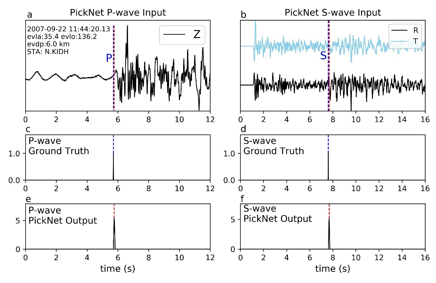 圖2 PickNet輸入輸出示意圖。(a和b),P波、S波對應臺站記錄(輸入);(c和d),震相到時脈沖序列(理想輸出);(e和f),PickNet輸出(實際輸出)