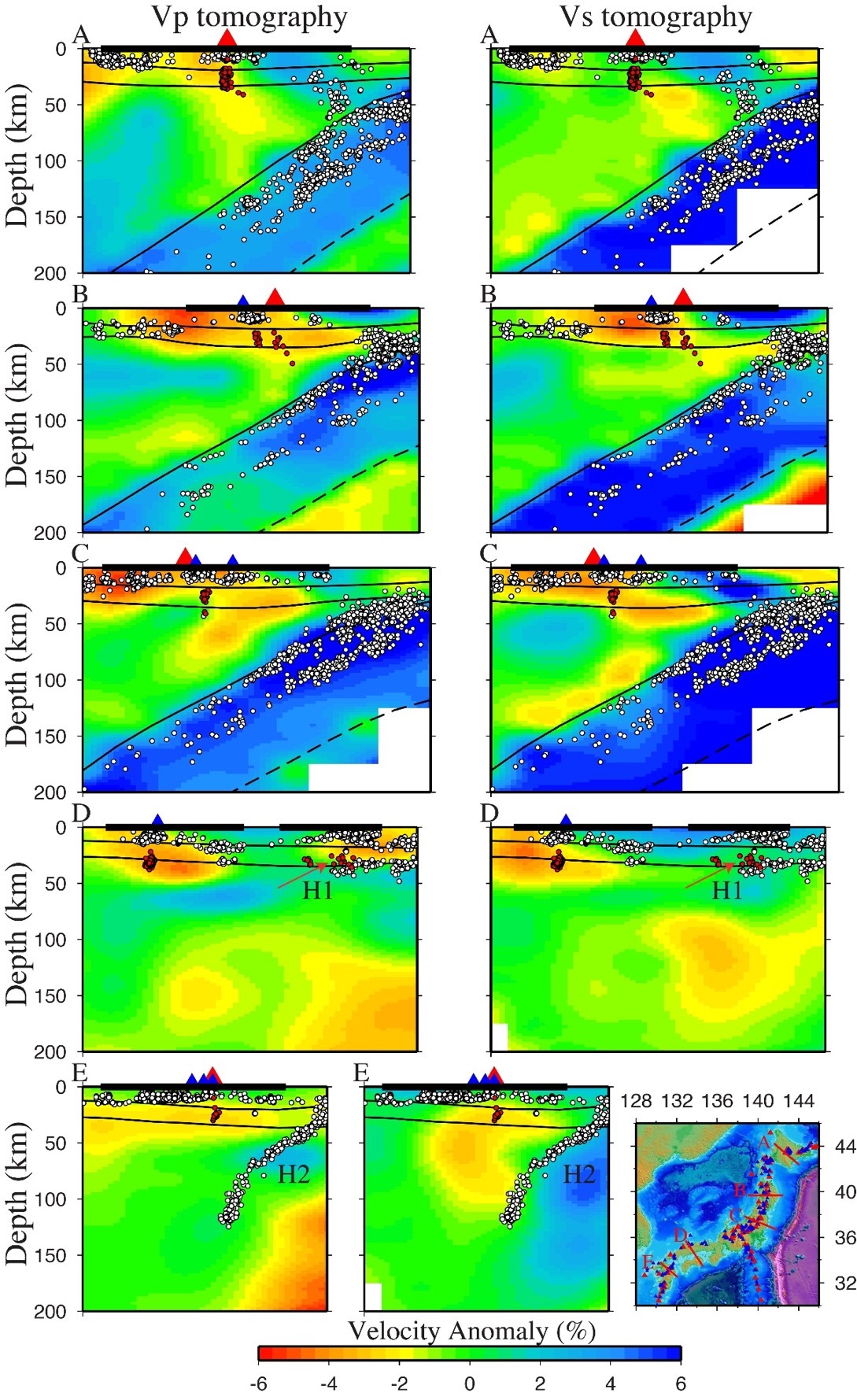 圖4 將PickNet拾取的震相數據直接用于層析成像反演得到的日本俯沖帶地區(qū)P波(左),S波(右)速度異常。成像結果揭示了菲律賓海板塊俯沖形態(tài)的變化、火山下方的低速體及其與低頻地震分布之間的聯(lián)系等,這些結果與前人層析成像結果有很好的一致性