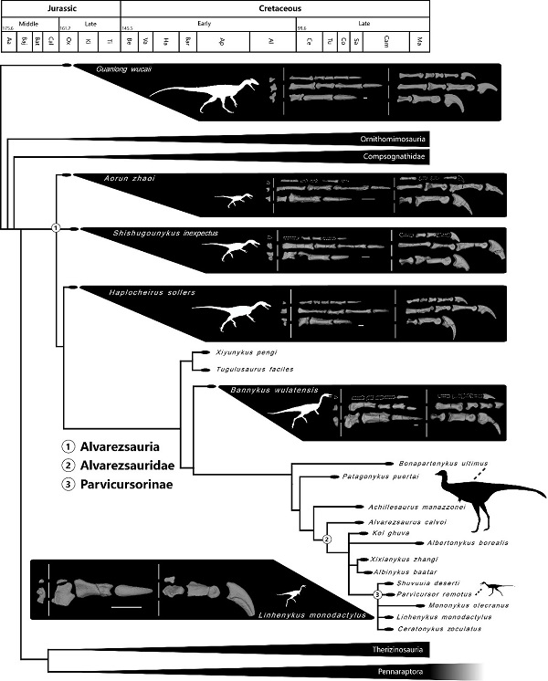 阿爾瓦雷斯龍類(Alvarezsauria)是一類高度特化的小型獸腳類恐龍,具有高度特化的前肢和修長的后肢,化石記錄分布于中-上侏羅統(tǒng)至上白堊統(tǒng),時間跨度近一億年。阿根廷科學(xué)家約瑟夫波拿巴(José Fernando Bonaparte)于1991年報道了此類群的第一種恐龍——卡氏阿爾瓦雷斯龍(Alvarezsaurus calvoi)。然而,此類群恐龍的后續(xù)研究波折不斷,部分晚白堊世的屬種被錯誤地鑒定為鳥類,這個類群在虛骨龍類的位置也遲遲不能確定。因此,這類恐龍也被稱為“謎一樣的恐龍”。隨著更多化石的發(fā)現(xiàn)和獸腳類恐龍系統(tǒng)學(xué)研究進步,學(xué)界目前公認阿爾瓦雷斯龍類是一類相對原始的虛骨龍類。然而,受限于稀缺的早期演化記錄和稀少的化石數(shù)量,阿爾瓦雷斯類仍然“充滿謎團”。