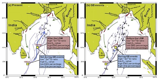 在東北印度洋,G-B河流系統(tǒng)在(a)現(xiàn)在和(b)G-B事件條件下的擴(kuò)散模式圖