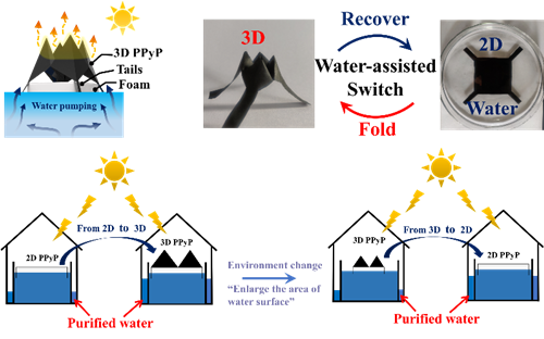 然而,當(dāng)處于一個(gè)不受限的系統(tǒng)中時(shí),2D結(jié)構(gòu)有時(shí)比3D結(jié)構(gòu)具有更大的優(yōu)勢(shì)。因此,怎樣簡(jiǎn)單、快速地實(shí)現(xiàn)光熱蒸發(fā)器2D/3D結(jié)構(gòu)的轉(zhuǎn)換來(lái)適應(yīng)不同的環(huán)境仍然面臨挑戰(zhàn)。該團(tuán)隊(duì)通過(guò)吡咯單體在纖維素紙表面原位氧化聚合得到聚吡咯雜化紙(PPyP),并利用對(duì)PPyP微觀/宏觀層面的協(xié)同調(diào)控,實(shí)現(xiàn)了最佳的光熱水純化速度。相比于傳統(tǒng)固定的3D結(jié)構(gòu),該P(yáng)PyP可實(shí)現(xiàn)2D/3D結(jié)構(gòu)的相互切換(如圖2),并具有很好的切換穩(wěn)定性,從而可以更好地適應(yīng)不同的應(yīng)用環(huán)境(ACS Appl. Mater. Inter. 2019,11,15498-15506)。