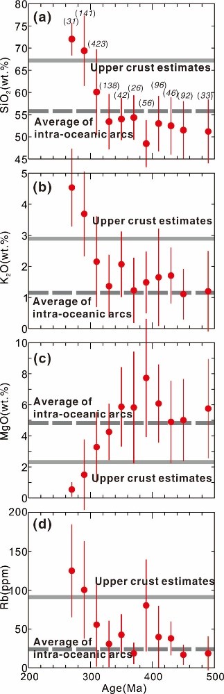 圖1:準(zhǔn)噶爾巖漿巖地球化學(xué)成分特征,300 Ma之前的巖漿巖具有低的SiO2, K2O,Rb和高M(jìn)gO含量,與洋內(nèi)弧地殼成分相一致。300 Ma之后的巖漿巖具有高的SiO2, K2O,Rb和低MgO含量,與大陸地殼的上地殼成分特征相吻合。因此,準(zhǔn)噶爾洋在300 Ma時(shí)從典型的洋內(nèi)弧地殼轉(zhuǎn)變?yōu)槌墒斓拇箨懙貧ぁ?/p>