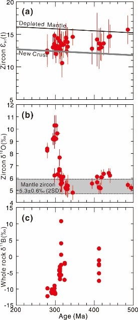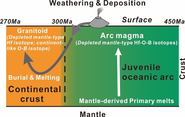 針對(duì)這一問(wèn)題,中國(guó)科學(xué)院廣州地球化學(xué)研究所研究員唐功建、王強(qiáng)、但衛(wèi)與澳大利亞悉尼大學(xué)的學(xué)者合作,選擇了中亞造山帶準(zhǔn)噶爾洋內(nèi)弧為研究對(duì)象。準(zhǔn)噶爾巖漿巖地球化學(xué)統(tǒng)計(jì)結(jié)果顯示在300 Ma的時(shí)候從典型的洋內(nèi)弧地殼轉(zhuǎn)變?yōu)槌墒斓拇箨懙貧?。?zhǔn)噶爾所有巖漿巖均具有虧損的鋯石Hf同位素特征,但是300 Ma之前和之后的巖漿巖具有明顯不同的鋯石O和全巖B同位素組成。300 Ma之前的巖漿巖具有低的鋯石O同位素特征和高的δ11B值,因此這些巖漿巖主要來(lái)源于虧損的軟流圈地幔楔,指示準(zhǔn)噶爾地殼的生長(zhǎng)發(fā)生在300 Ma之前。300 Ma之后的巖漿巖雖然也具有虧損地幔特征的Hf同位素組成,但是這些巖石具有非常高的鋯石O和低的全巖δ11B值,與成熟大陸地殼同位素組成相一致。同時(shí)早二疊世花崗巖中的部分鋯石核的年齡為晚石炭世,這些鋯石核具有地幔特征的O同位素組成,與石炭紀(jì)巖漿巖相一致。因此,這些300 Ma之后的巖漿巖主要形成于準(zhǔn)噶爾石炭紀(jì)洋內(nèi)弧地殼風(fēng)化的火山沉積物的熔融。元素和同位素計(jì)算顯示對(duì)于這些300 Ma之后的巖漿巖其源區(qū)含有大于50%的火山沉積物。