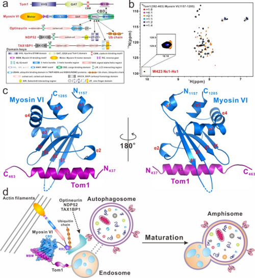 細(xì)胞自噬(autophagy)是真核細(xì)胞內(nèi)一種必不可少且高度受調(diào)控的,利用溶酶體來(lái)清除大型蛋白聚集體、受損細(xì)胞器、入侵病原體等成分以應(yīng)對(duì)內(nèi)外界細(xì)胞壓力和維持細(xì)胞動(dòng)態(tài)平衡的重要分解代謝過(guò)程。細(xì)胞自噬在細(xì)胞生長(zhǎng)、胚胎發(fā)育、天然免疫等眾多生理過(guò)程中扮演著重要的角色。Myosin VI是真核細(xì)胞內(nèi)唯一一個(gè)沿著微絲反向運(yùn)輸(從微絲正端向負(fù)端運(yùn)輸)的非經(jīng)典的肌球蛋白分子馬達(dá),在細(xì)胞自噬和內(nèi)吞途徑等眾多的細(xì)胞過(guò)程中扮演著重要的角色,其功能的缺失或異常與大量的人類疾病相關(guān)聯(lián),例如,肥厚性心肌病、宮頸癌、前列腺癌癥、耳聾、腦星形膠質(zhì)細(xì)胞增多癥等。在自噬過(guò)程中,Myosin VI可以通過(guò)結(jié)合內(nèi)吞體相關(guān)蛋白Tom1以及自噬受體蛋白TAX1BP1、NDP52和Optineurin,介導(dǎo)內(nèi)吞體和自噬體的融合,并促進(jìn)自噬體的成熟。然而,由于缺乏詳細(xì)的機(jī)制研究,Myosin VI如何精準(zhǔn)地識(shí)別Tom1,兩者的結(jié)合模式又是怎樣?Myosin VI是怎樣通過(guò)與Tom1以及自噬受體蛋白的結(jié)合從而促進(jìn)自噬體和內(nèi)吞體的融合?這些問(wèn)題目前尚不清楚。