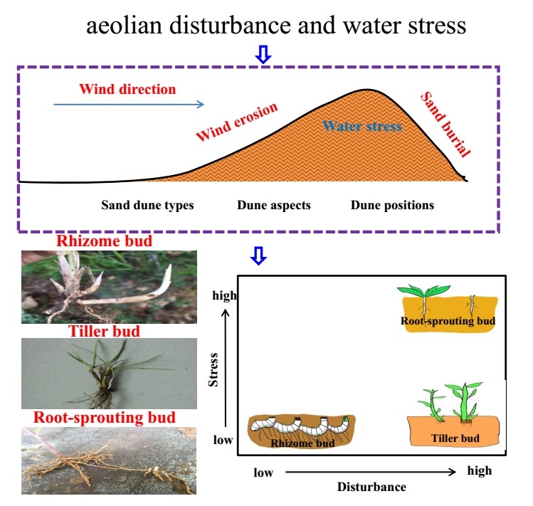 相關(guān)研究結(jié)果以Responses of belowground bud bank to disturbance and stress in the sand dune ecosystem 為題發(fā)表于Ecological Indicators 雜志?;哪乐谓M助研馬群為第一作者,研究員劉志民為通訊作者。