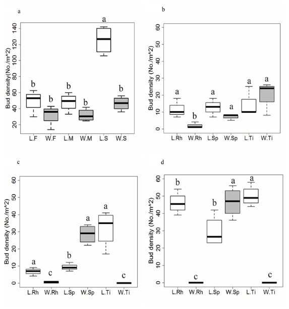 鑒于此,中國(guó)科學(xué)院沈陽(yáng)應(yīng)用生態(tài)研究所荒漠化防治組在烏蘭敖都試驗(yàn)站選擇三個(gè)沙丘類型(流動(dòng)、半固定、固定沙丘),五個(gè)沙丘位置(丘間地、過(guò)渡帶、坡底、坡中、坡上)和兩個(gè)坡面(迎風(fēng)坡、背風(fēng)坡),沙丘類型作為干擾梯度(由固定沙丘到流動(dòng)沙丘風(fēng)沙干擾逐漸增強(qiáng)),沙丘坡面作為不同干擾類型(迎風(fēng)坡風(fēng)蝕為主、背風(fēng)坡沙埋為主),沙丘位置作為水分脅迫梯度(有沙丘底部到沙丘頂部水分脅迫逐漸增強(qiáng))(圖1)。該研究采用R中的線性回歸方程(Linear regression equations,Y=ax+b)和線性混合效應(yīng)模型(Linear mixed effect models, Y= [β0aspect] fixed + [γ type]random)來(lái)探討風(fēng)沙干擾和水分脅迫如何作用沙丘生態(tài)系統(tǒng)的芽庫(kù)繁殖力,假設(shè):根蘗芽在干擾生境中占優(yōu)勢(shì),分蘗芽在脅迫生境中占優(yōu)勢(shì)。結(jié)果顯示:1)不同芽庫(kù)類型對(duì)干擾和脅迫顯示出不同的適應(yīng)策略(圖2):根蘗芽更適于風(fēng)沙干擾生境(脅迫忍耐型雜草策略),分蘗芽更適于沙埋干擾生境和低水分脅迫生境(雜草策略),根莖芽對(duì)水分脅迫更敏感并且適于較低干擾強(qiáng)度(競(jìng)爭(zhēng)型策略);2)中等程度干擾和脅迫生境的植物比其他生境產(chǎn)生更多的芽。因此芽庫(kù)生存策略和表型響應(yīng)可以作為分析種群繁殖的指示物,在沙丘管理予以深思。