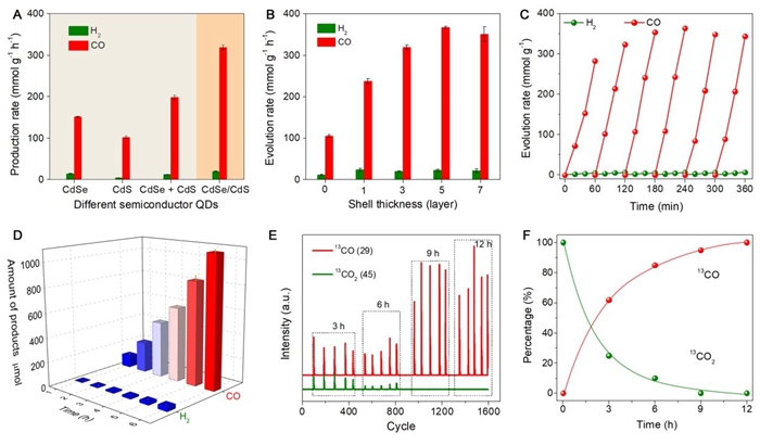圖2. 量子點(diǎn)光催化還原CO2。(A)不同半導(dǎo)體量子點(diǎn)作為光催化劑的光催化CO2還原反應(yīng)速率。(B)相同條件下,不同CdS殼層厚度修飾的CdSe量子點(diǎn)的光催化CO2還原速率。(C) 催化劑的循環(huán)利用。(D) AM1.5光照。(E-F) 13C標(biāo)記實(shí)驗(yàn)。