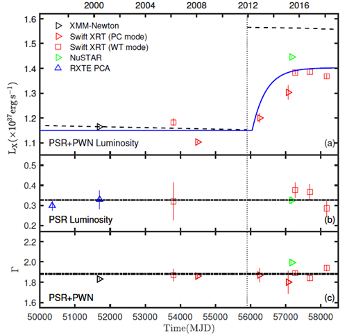 圖2:PSR B0540-69及其星風云的光度變化。(a)脈沖星和星風云總的X光度變化,可以明顯看出脈沖星自轉狀態(tài)發(fā)生突變之后,X射線光度在逐漸增加并達到飽和;(b)PSR B0540-69脈沖輻射本身的光度一直保持不變;(c)脈沖星和星風云總體的輻射能譜指數(shù)沒有明顯變化。圖中豎的虛線表示自轉狀態(tài)突變的時間。(圖片來源:高能所/Nature Astronomy)