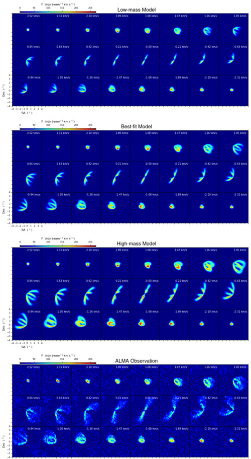 圖:不同原行星盤質(zhì)量下的CO多通道圖與ALMA觀測對比。從上至下:低質(zhì)量模型,最佳擬合,高質(zhì)量模型。