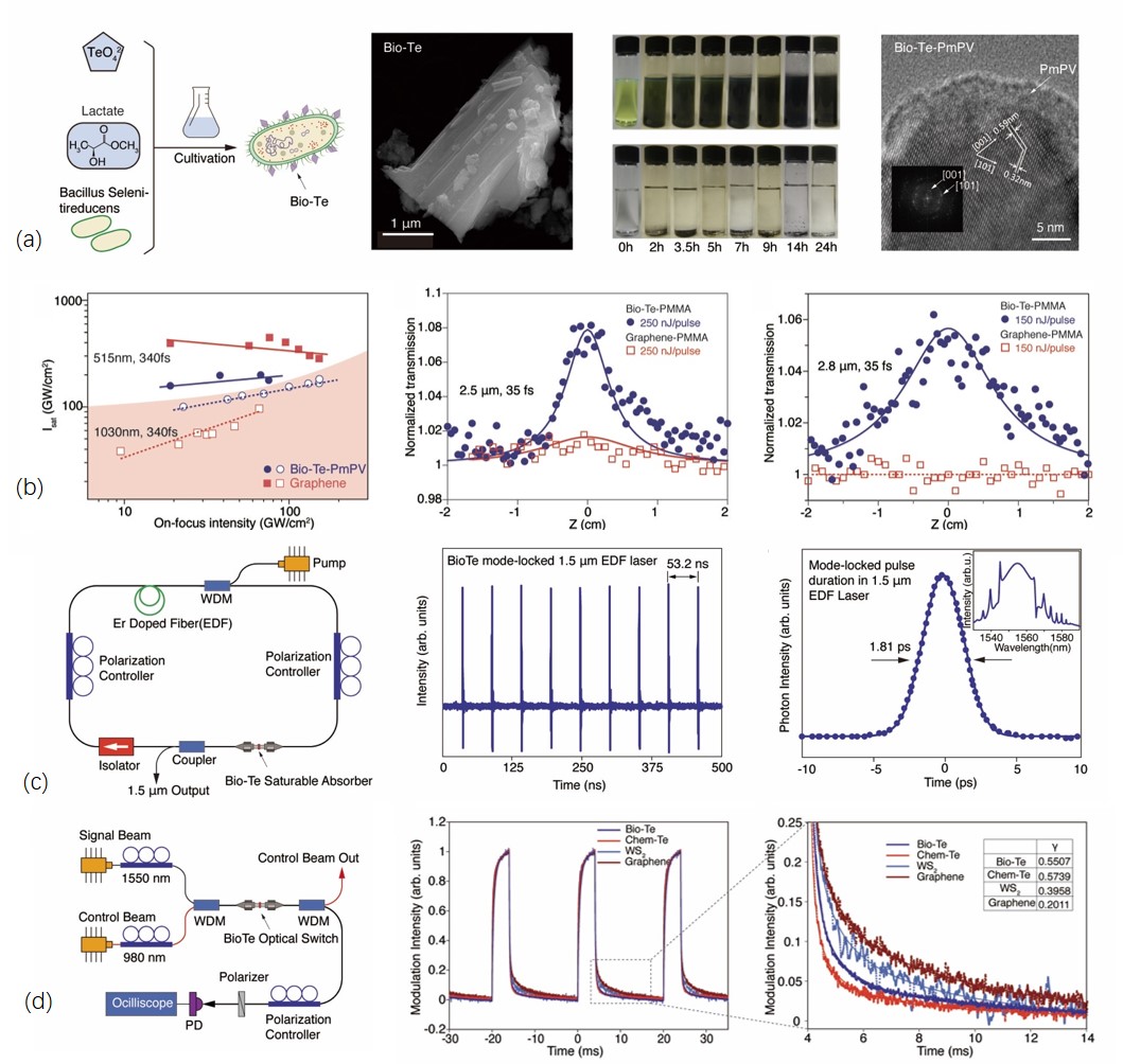 (a)微生物合成Te納米晶,(b)可見(jiàn)到中紅外廣域飽和吸收性質(zhì),(c)紅外超短脈沖輸出,(d) 優(yōu)異的光開關(guān)性能。