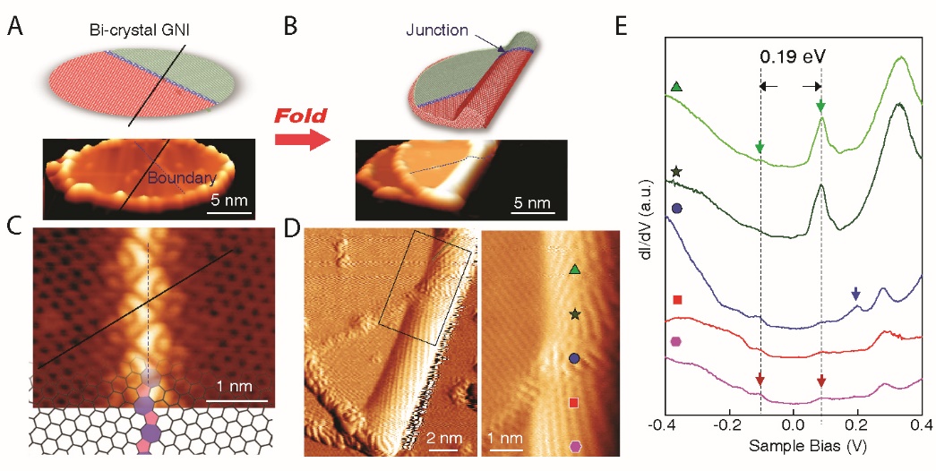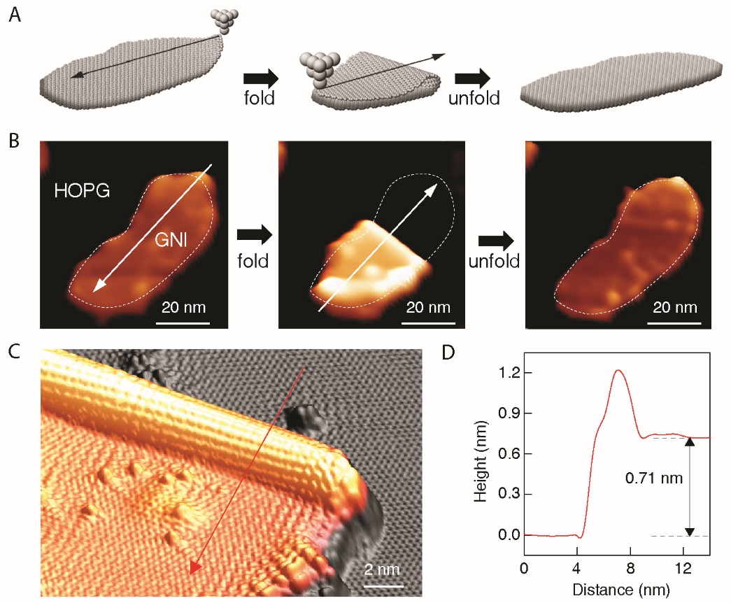 “折紙術”是一種把紙張折出各種特定形狀和花樣的藝術。藝術家們通過精妙的手法,把簡單與單調的二維紙張變成豐富多彩的三維結構。受這種藝術的啟發(fā),折疊操縱經(jīng)常被巧妙地用在很多科學技術前沿領域,用來構筑形狀與功能各異的結構、器件甚至機器,例如生物學領域可以將DNA單鏈折疊成復雜的二維形狀。在宏觀尺度下,受折紙術的啟發(fā),科學家已經(jīng)能夠構建出石墨烯功能器件甚至機器模型。理論預測發(fā)現(xiàn),在原子尺度,通過對石墨烯的彎曲折疊,可以構筑出具有新奇電子學特性的納米結構。然而,石墨烯彎曲結構的電子學性質容易受到局域的空位、增原子、邊界等缺陷結構的影響。在單原子尺度精確地折疊石墨烯,特別是根據(jù)特殊需要沿特定方向對石墨烯進行折疊,具有極大的挑戰(zhàn)性。