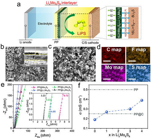 圖1. PP@LixMo6S8相關(guān)性質(zhì)表征及其在鋰-硫電池中工作原理示意圖