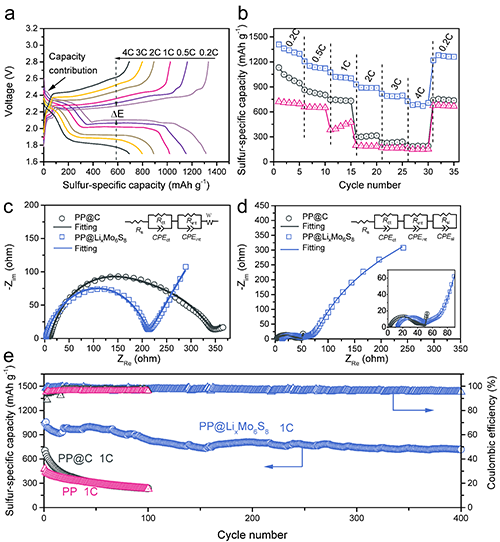 圖3. PP@LixMo6S8功能隔膜在扣式鋰-硫電池中電化學(xué)性能