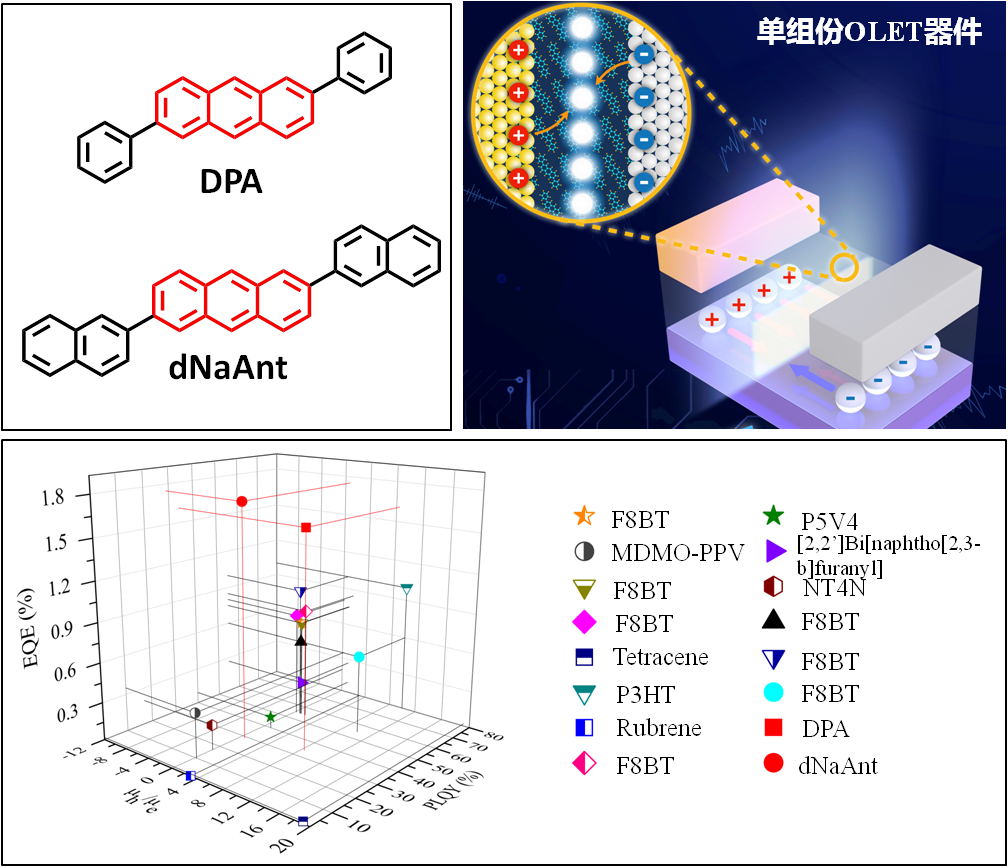 高遷移率發(fā)光材料DPA和dNaAnt分子結(jié)構(gòu)式、OLET器件示意圖和目前報(bào)道的單組份OLET的EQE效率總結(jié)圖
